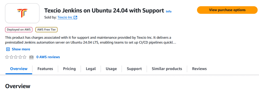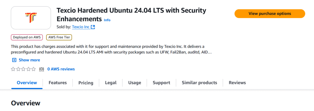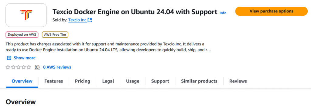 This product has charges associated with it for support and maintenance provided by Texcio Inc. It delivers a ready to use Docker Engine installation on Ubuntu 24.04 LTS, allowing developers to quickly build, ship, and run containers on AWS.
