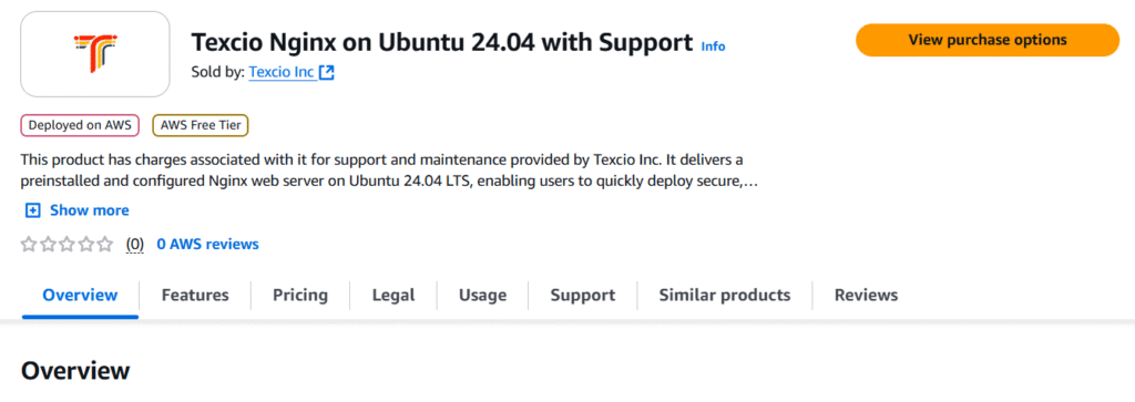 This product has charges associated with it for support and maintenance provided by Texcio Inc. It delivers a preinstalled and configured Nginx web server on Ubuntu 24.04 LTS, enabling users to quickly deploy secure, high performance web applications.